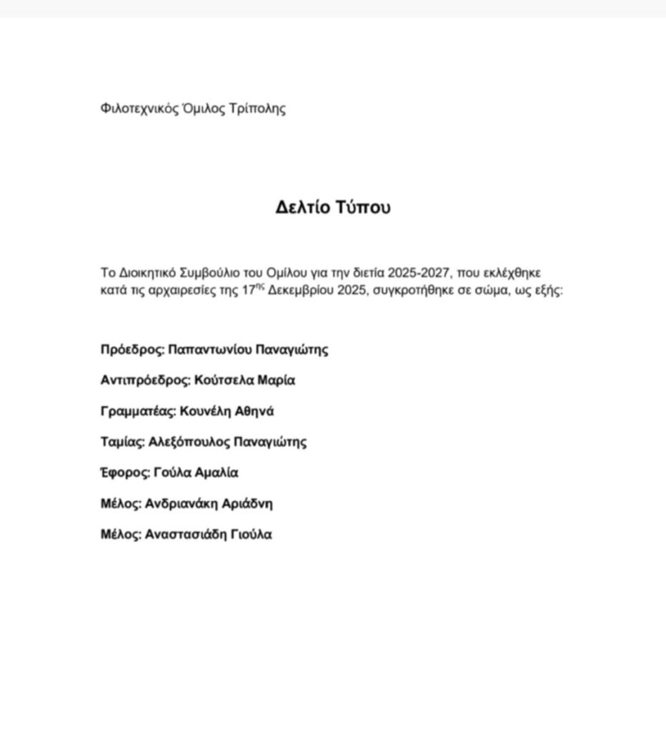 Νέο Διοικητικό Συμβούλιο Posted in Τα Νέα μας, Τα Νέα του Φ.Ο.Τ. by ΜΑΡΙΑ ΚΟΥΤΣΕΛΑ on 24 Δεκεμβρίου 2025 Tweet Please follow and like us: Related Posts Εργαστήρι Ζωγραφικής για Ενήλικες Posted on 28 Ιανουαρίου 2026 Εργαστήρι Φωτογραφίας για Αρχάριους -2026 Posted on 28 Ιανουαρίου 2026 Ευχές Posted on 24 Δεκεμβρίου 2025