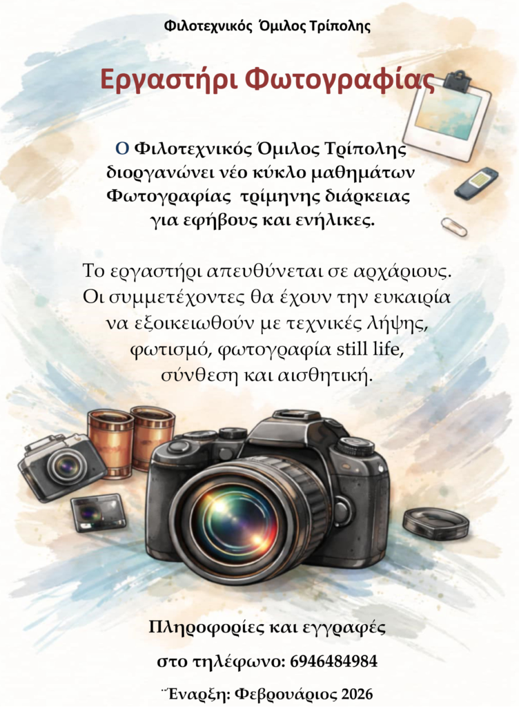 Εργαστήρι Φωτογραφίας για Αρχάριους -2026 Posted in Εργαστήρι Φωτογραφίας, Τα Νέα μας, Τα Νέα του Φ.Ο.Τ. by ΜΑΡΙΑ ΚΟΥΤΣΕΛΑ on 28 Ιανουαρίου 2026 Tweet Please follow and like us: Related Posts Εργαστήρι Ζωγραφικής για Ενήλικες Posted on 28 Ιανουαρίου 2026 Ευχές Posted on 24 Δεκεμβρίου 2025 Νέο Διοικητικό Συμβούλιο Posted on 24 Δεκεμβρίου 2025