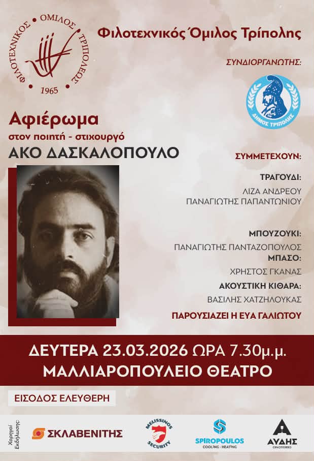 Αφιέρωμα στον ποιητή-στιχουργό Άκο Δασκαλόπουλο Posted in ΕΚΔΗΛΩΣΕΙΣ, Μουσικές εκδηλώσεις/Συναυλίες, Τα Νέα μας, Τα Νέα του Φ.Ο.Τ. by ΜΑΡΙΑ ΚΟΥΤΣΕΛΑ on 19 Μαρτίου 2026 Tweet Please follow and like us: Related Posts Εκδήλωση για την ελληνική γλώσσα Posted on 03 Μαρτίου 2026 Λουκάς Βασιλικός- Εργαστήρι φωτογραφίας Posted on 06 Φεβρουαρίου 2026 Παρουσίαση βιβλίου του Θόδωρου Μαραγκού Posted on 05 Φεβρουαρίου 2026