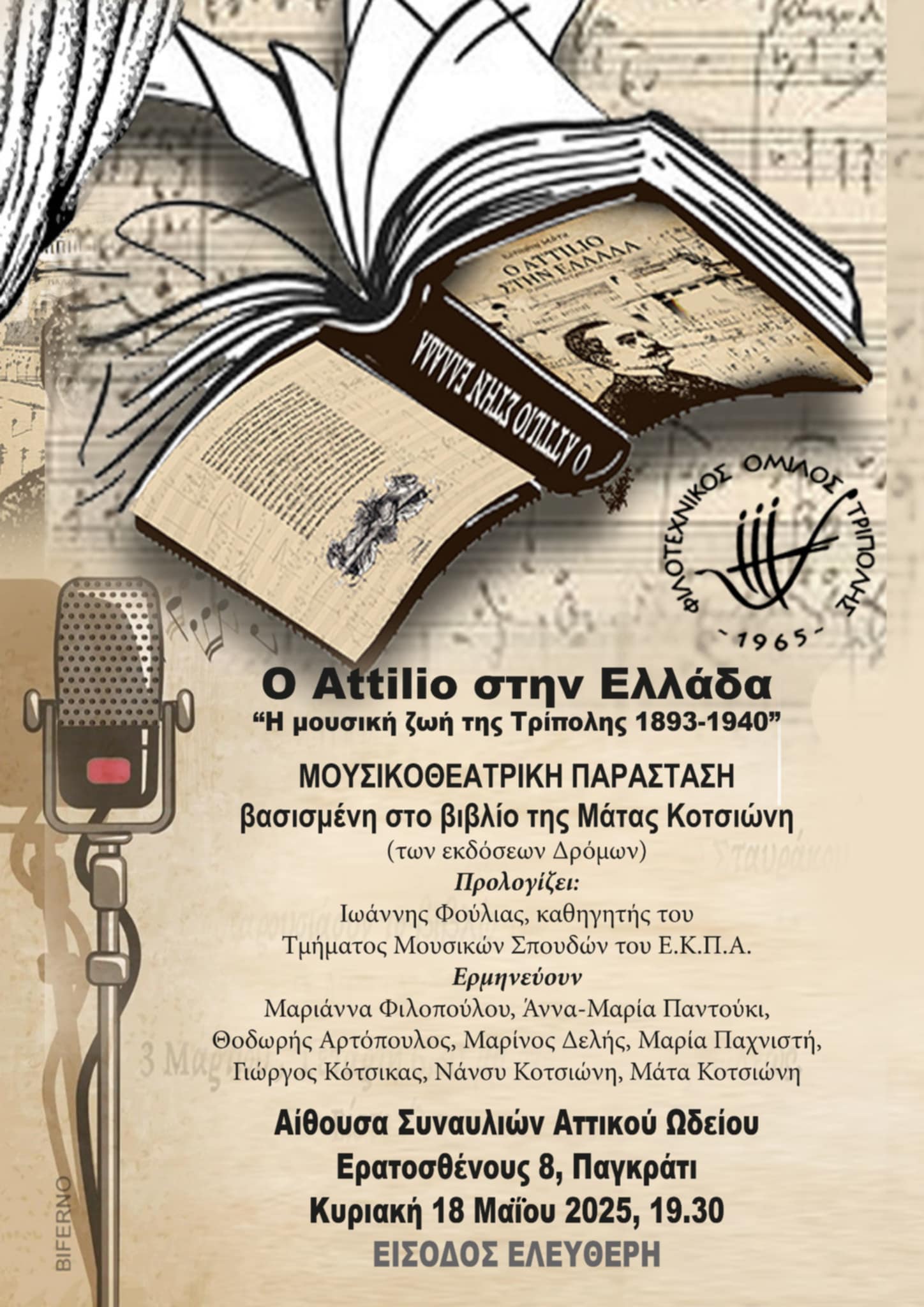 Posted on 28 Νοεμβρίου 2025Ο Φιλοτεχνικός Όμιλος Τρίπολης διοργανώνει την Παρασκευή, 28 Νοεμβρίου 2025, στις 9 μ.μ. στο Μουσικό Σχολείο Τρίπολης, μουσικο-λογοτεχνική βραδιά με θέμα: “Η πόλη των ονείρων” Η εκδήλωση είναι ένα αφιέρωμα στους δυο μεγάλους δημιουργούς Μάνο Χατζιδάκι και Μίκη Θεοδωράκη, ...